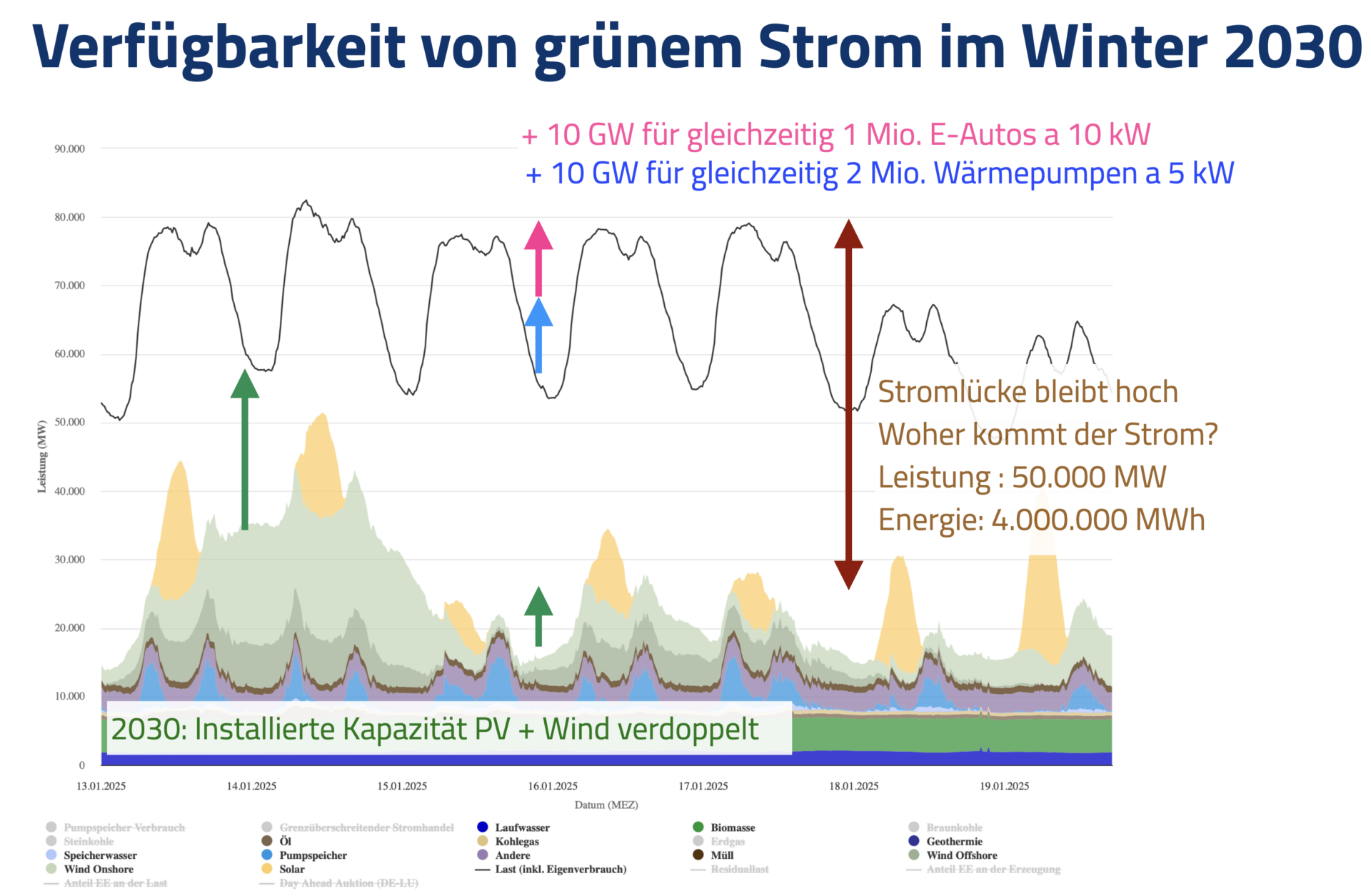 Gerade in den Wintermonaten sind wir beim Strom auf dessen Erzeugung in heute fossil befeuerten Kraftwerken angewiesen. Daran wird sich auch bis 2030 nicht viel ändern (die Grafik unten zeigt nur die Stromerzeugung aus erneuerbaren Energien; grüne Pfeile zeigen die grüne Stromerzeugung bei der bis 2030 geplanten Verdopplung der heutigen Kapazitäten von heute 200.000 auf dann 400.000 Megawatt Leistung!)