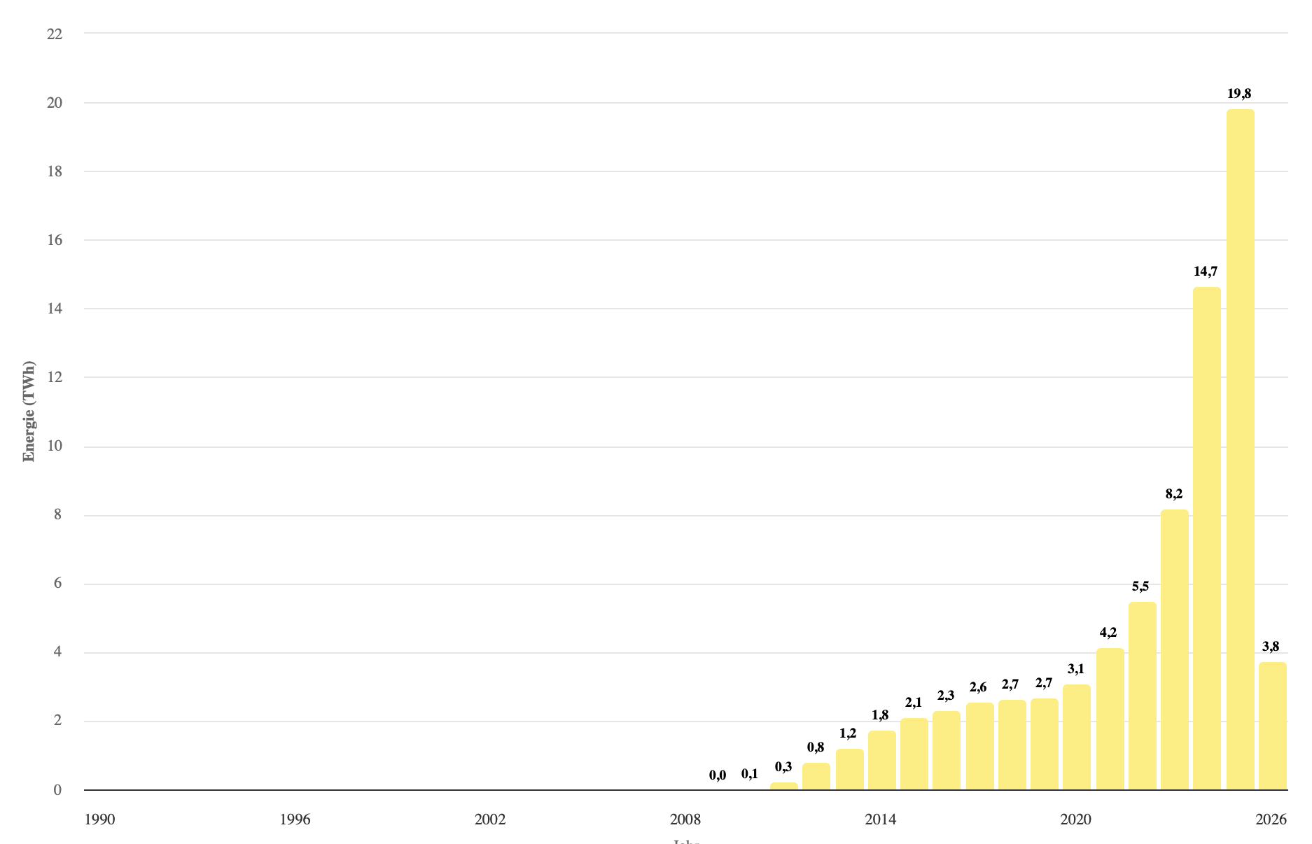 Die Grafik aus den Energy Charts (Fraunhofer ISE) zeigt sehr schön die rasante Entwicklung der letzten Jahre, die sehr viel mit den niedrigen Preisen der Photovoltaik-Module zu tun hat: