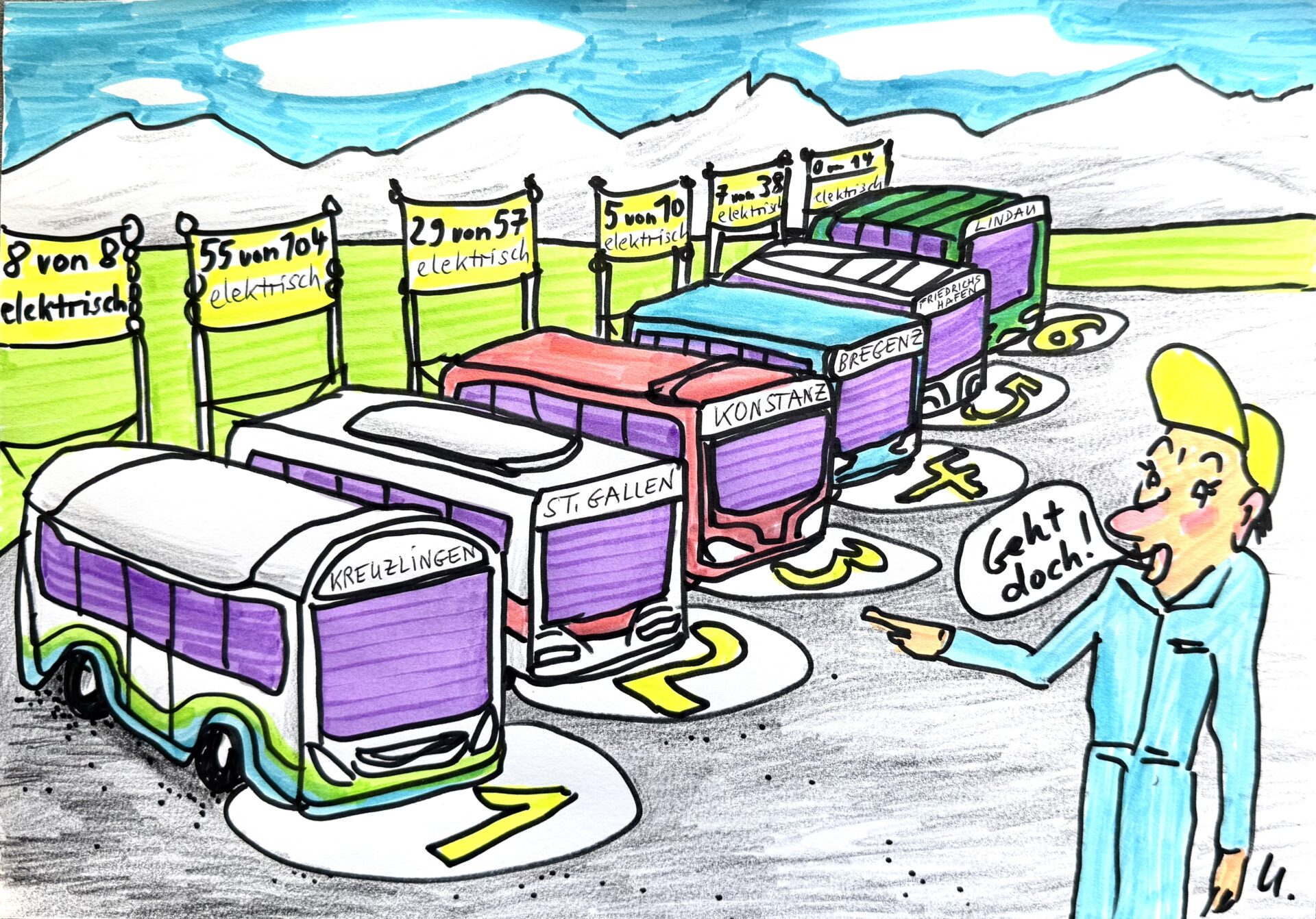 Das benachbarte Konstanz (85.000 Einwohner) bedient alle Linien des ÖPNV u.a. mit 29 neuen E-Bussen und ist stolz darauf, dass die mit Öko-Strom betankten Fahrzeuge dafür sorgen, dass jährlich 1.500 Tonen CO2 vermieden werden.
