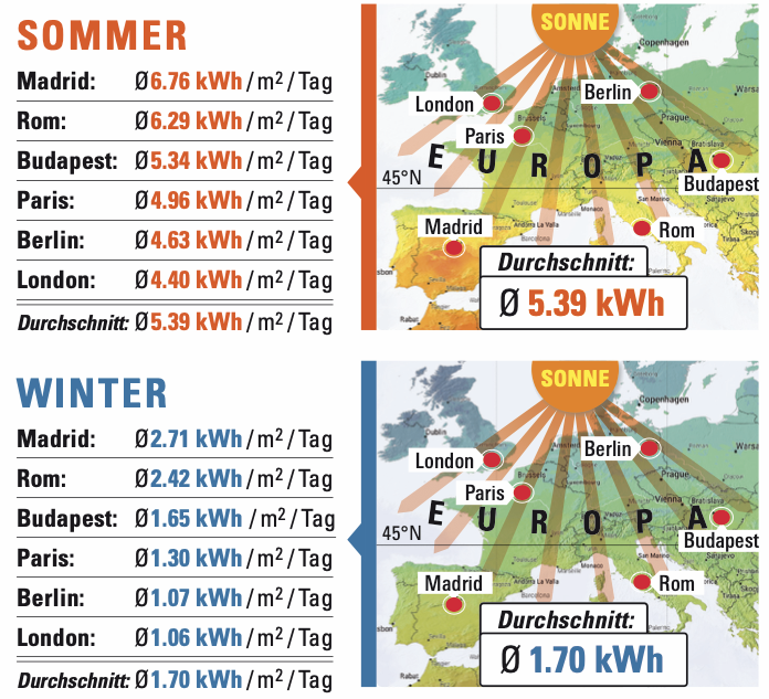 Vor einigen Tagen erhielt ich von Arno A. Evers, einem langjährigen Wegbegleiter, der bereits im Jahr 1995 den Gemeinschaftsstand Wasserstoff und Brennstoffzellen auf der Hannover-Messe gegründet hatte (siehe link. ) Arno ist mit seinem Team weiter aktiv und hat eine eindrucksvollen Sammlung an Grafiken zur Sonnenenergie geschaffen. Die Grafik unten zeigt die Sonneneinstrahlung für Europa im Sommer und im Winter, in dem sie sich auf etwa ein Viertel reduziert (grün und blau = wenig Sonne, gelb und rot = viel Sonne).