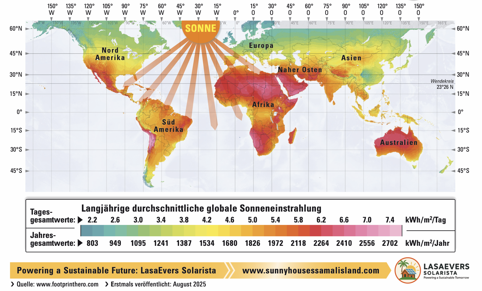 Beim Betrachten der globalen Sonneneinstrahlung in der Grafik unten können wir schnell erkennen, dass in vielen Teilen Afrikas etwa dreimal so viel Sonne scheint als bei uns in Deutschland. Wir kommen auf etwa 130 Tage Sonnenschein. Im Sonnengürtel sind es of mehr als 350 Tage!