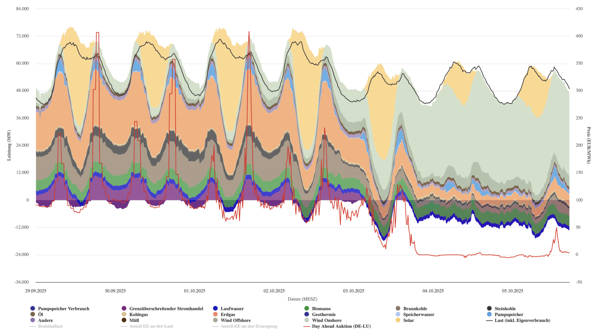 Die schwarze Linie zeigt den deutschen Stromverbrauch in der Woche vom 29.9.25, der je nach Tageszeit und Wochentag deutlich schwankt: Zur Mittagszeit wird viel Strom verbraucht, nachts und an den Feiertagen und Wochenenden weniger.